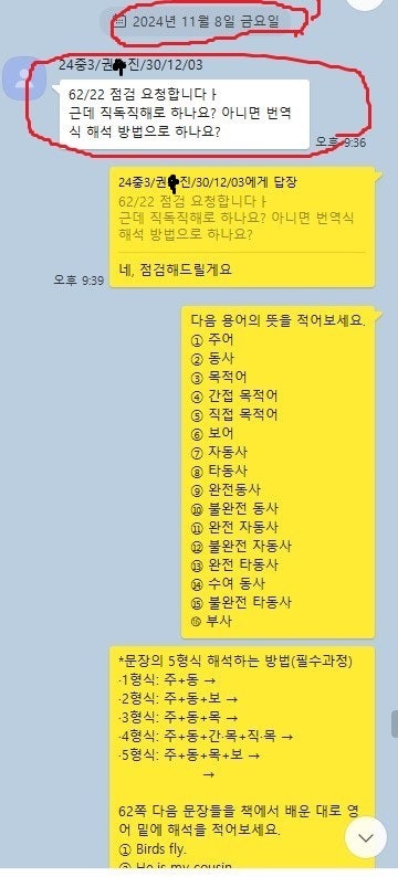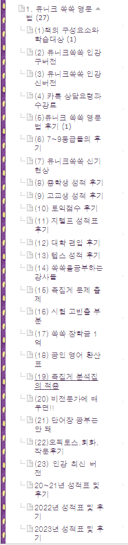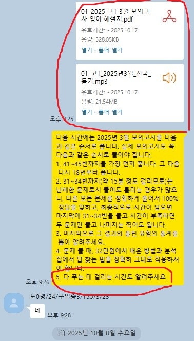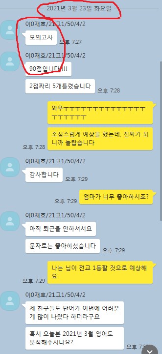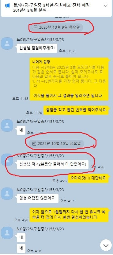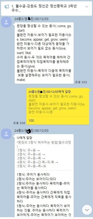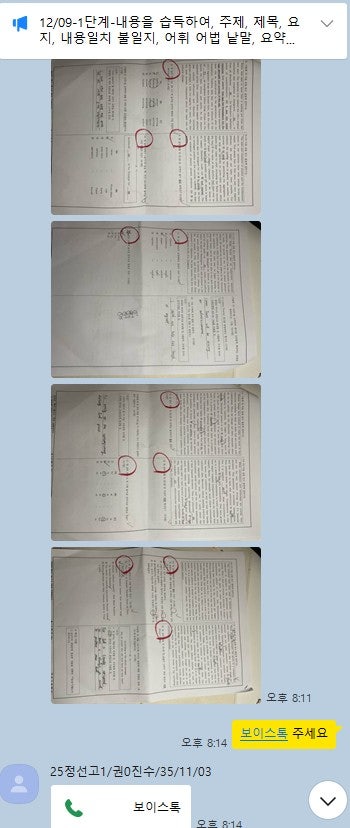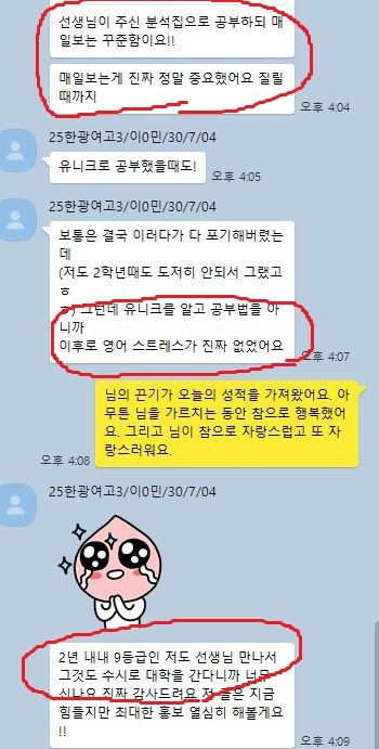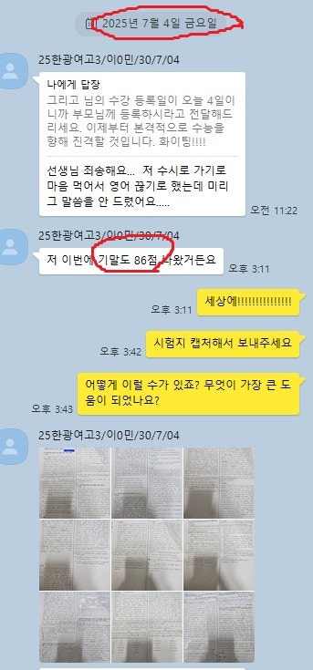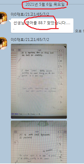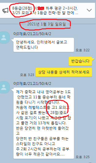 어떻게 공부하는지 카톡 공부 내용을 충분히 첨부할 테니 꼼꼼히 읽어보세요. 중.고생 후기는 카테고리 1번의 (8/9)번에 모두 들어 있고 7~9등급들의 후기는 (6)번에 들어있습니다.