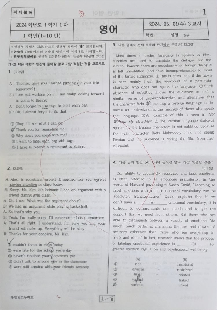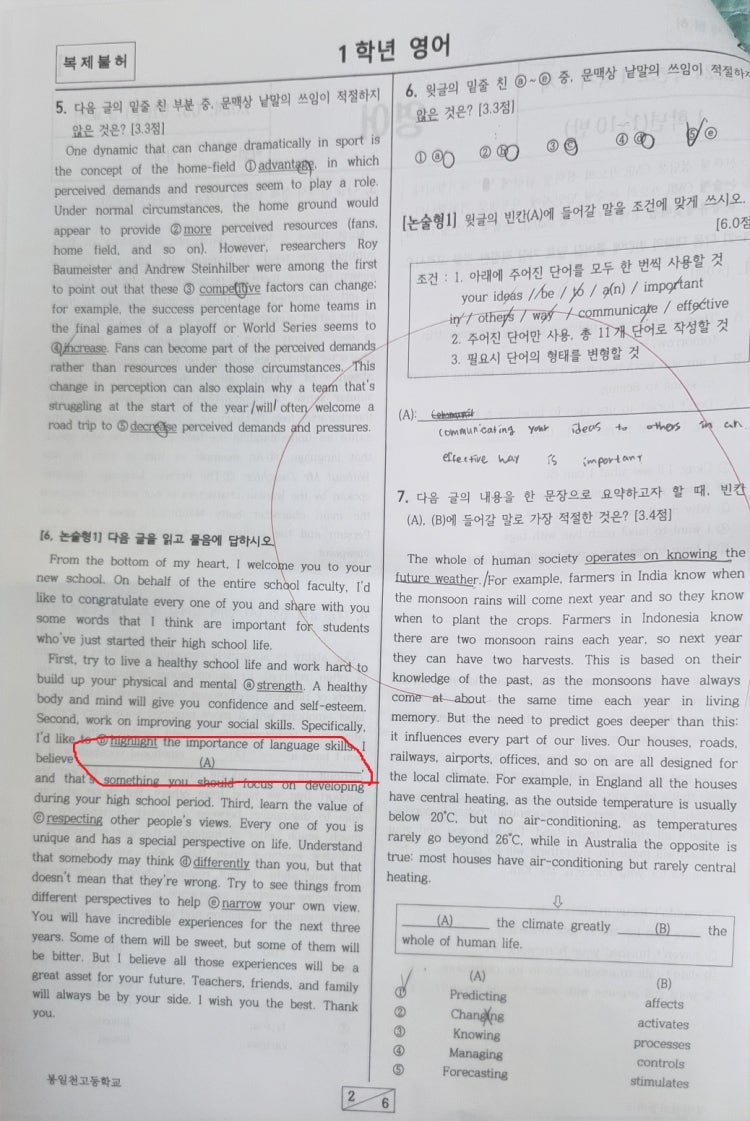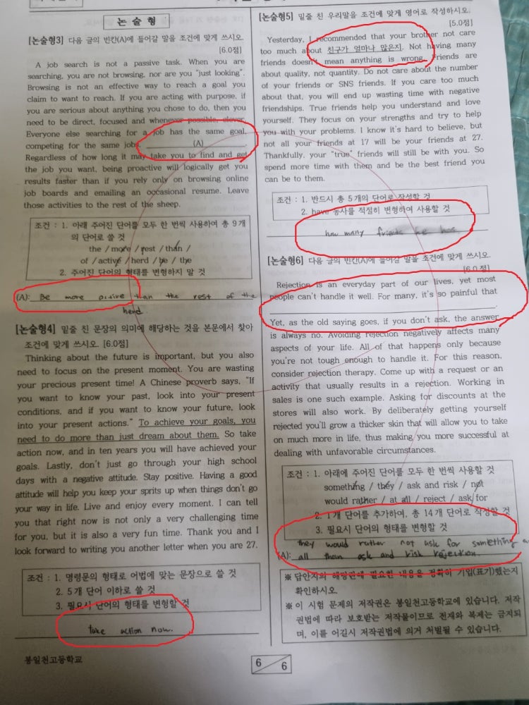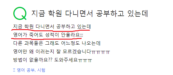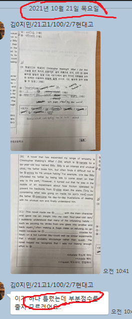 특히 고교 과정은 범위가 많고 변형문제와 서술형 문제와 영작 문제가 많아서 대학입시 전문가에게 체계적으로 배워야하는데, 고교 시험 경향을 모르는 비전문가들의 지도를 받으면서 단어장이나 통문장을 암기하거나, 출제되지도 않는 문제를 양치기로 풀면 아무리 발버둥이 쳐도 다음 학생들처럼 허송세월을 보내게 됩니다. 중학교 시절 90~100점대가 고교에서 20~30점대를 맞기도 합니다. 소위 말해서 폭망합니다. 심지어 10점대를 맞기도 합니다.