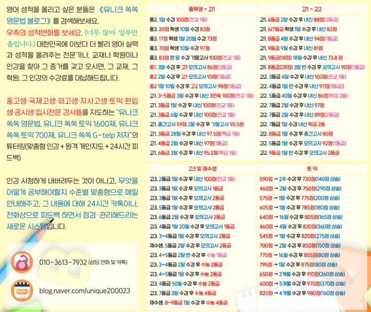 질문자 같은 학습자들 이곳에 <<학원 수강료로>> 편안한 요일과 편안한 시간에 1:1로 24시간 배울 수 있고, 24시간 자유롭게 질문하고 보이스톡으로 피드백 하면서, 7~9등급들도 단기간에 1등급을 달성하게 해드리는 입시 전문가(유니크 쏙쏙 영문법 저자)가의 족집게 튜터링(수준별 맞춤형 인강+1:1 원격 개인지도+24시간 피드백=학원 수강료) 이 있으니 수많은 성적표를 보시고 참고해보세요. 성적표 첨부합니다. 블로그에 1000명이 넘는 학생들의 후기와 성적표/합격증이 업로드 되어 있으니 직접 확인해보세요.